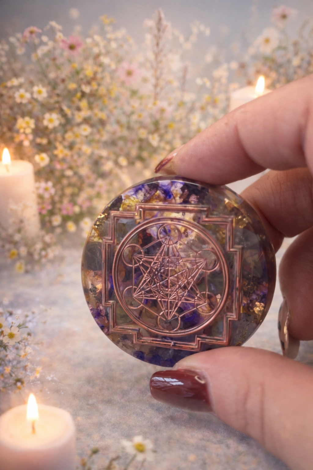 Cette création énergétique associe la puissance de l’améthyste, de l’obsidienne et du cristal de roche, intégrées dans la résine autour de la géométrie sacrée du Cube de Métatron, symbole d’harmonie universelle et de protection.